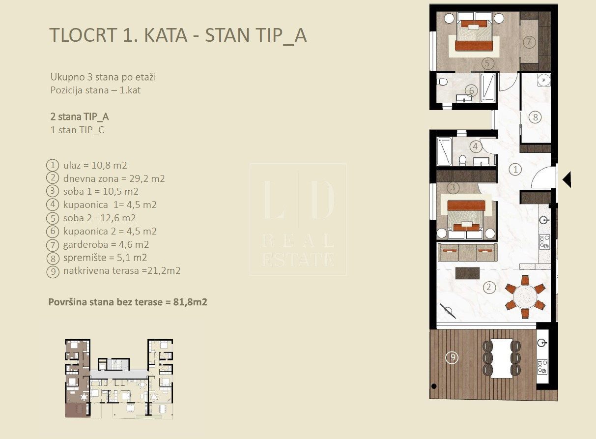 L'appartamento si trova al 1 piano ed è composto da soggiorno, sala da pranzo, 2 camere da letto, 2 bagni e un terrazzo/veranda coperto di 21 mq collegato al soggiorno e alla cucina. L'appartamento dispone inoltre di una stanza tecnica/lavanderia.