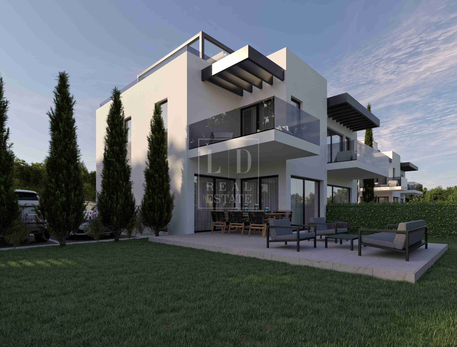 Il piano terra della casa è composto da cucina, sala da pranzo, wc e soggiorno con terrazzo coperto di 9,70 mq che si collega al giardino della casa.
