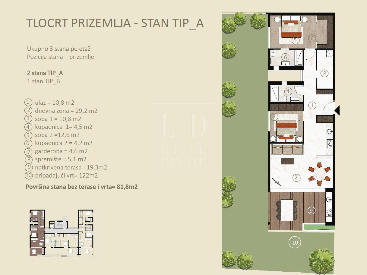 Apartma se nahaja v pritličju in je sestavljen iz dnevne sobe, jedilnice, 2 spalnic, 2 kopalnic in pokrite terase/verande 19 m2, povezane z dnevno sobo in kuhinjo. Stanovanju pripada tudi vrt 122 m2.