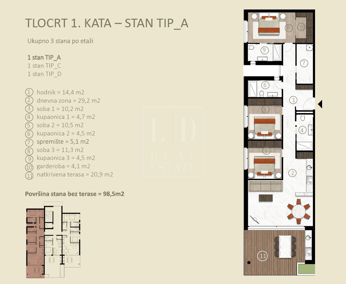 Stanovanje se nahaja v prvem nadstropju in je sestavljeno iz dnevne sobe, jedilnice, 3 spalnic, 3 kopalnic in pokrite terase/verande 20,9 m2, povezane z dnevno sobo in kuhinjo.